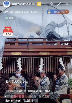 2022年7月15日の配信では、ユネスコの無形文化遺産に登録されている千葉県香取市の夏祭り「佐原の大祭」に密着。まるで実際に祭りに参加しているような目線で、臨場感あふれる神輿に迫りました。あいにくの天候の中、雨ガッパを羽織って神輿を引く人、法被にハチマキ姿のおはやし演奏や盆踊りは、日本人にとって見慣れた”地元のハレの日”ですが、中国人にとっては非日常体験です。3時間半に及ぶ生配信で合計154万視聴を記録。これは日本発の配信で最高クラスとなる数字で「青山246放送部」ライブ配信開始から2ヶ月半で最高の視聴数となりました。
