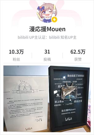 「漫応援Mouen」は、bilibili社とも連携しながら、人気俳優を起用した良質なエンターテインメントコンテンツを配信しています。チャンネル開設から約7ヶ月が経過した9月13日現在で、登録者数10.3万人、合計再生数636万回、いいね数62.5万を記録しており、bilibili社から公式アカウントとして認定されました。
