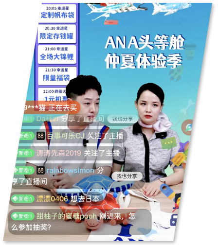 中国市場最大のECプラットフォーム、Tmallに出店している全日空海外旗艦店のライブチャンネル。中国国内のイベントカレンダーにあわせた商品をピックアップし、リアルタイムで商品を紹介、コメント機能を介して視聴ユーザーの質問や要望にその場で応えていくコミュニケーションで、中国市場の今に合わせた販売を実施しています。